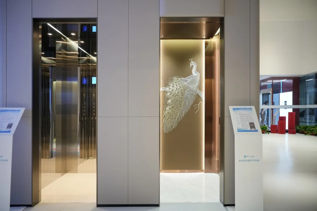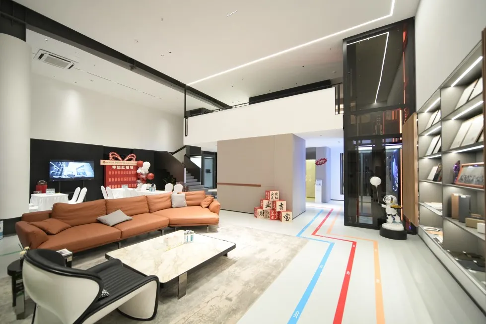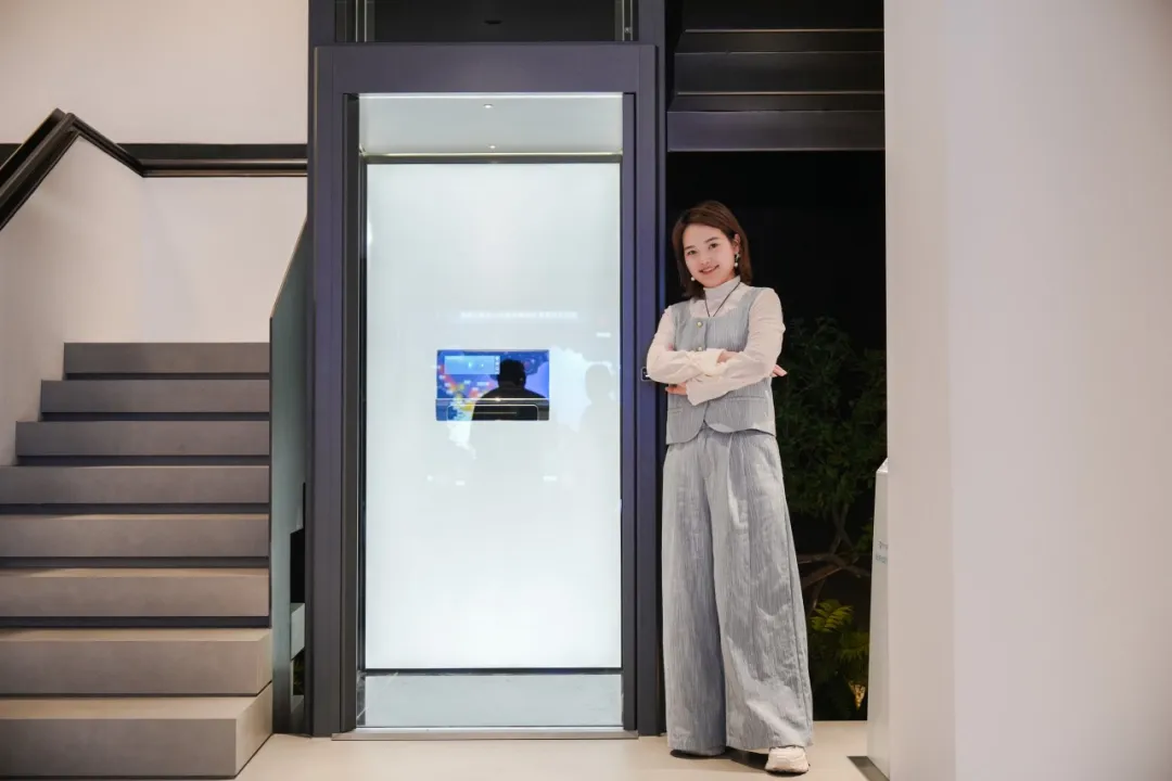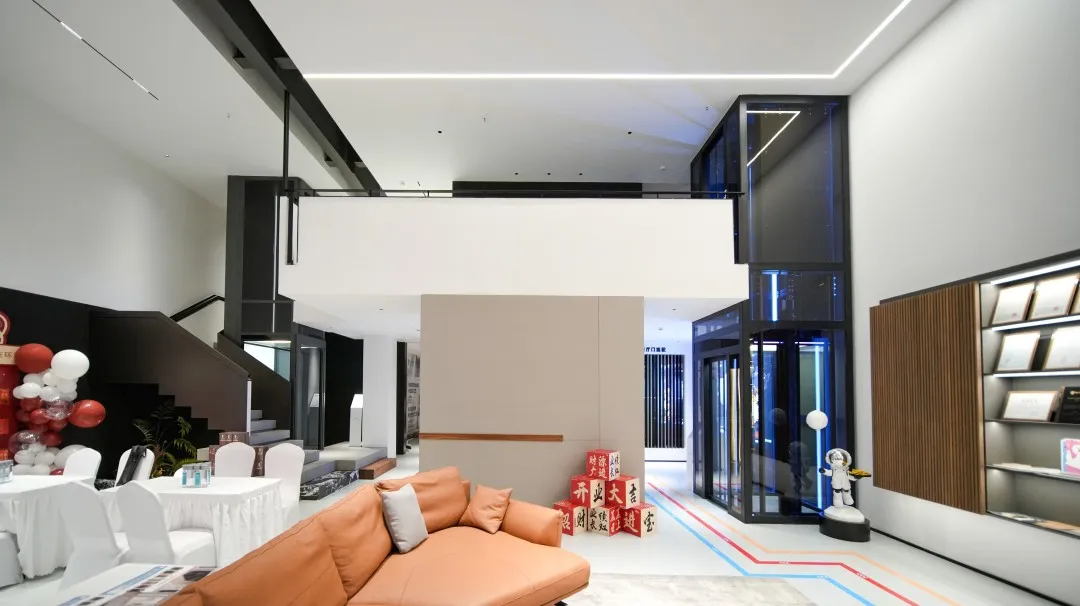 出手即为经典。玉环旗舰店以带轿厢款枪灰色平台电梯和经典黑色观光电梯,作为空间的C位担当。太空人触摸外呼与雷达智能感应外呼,让满满的理性科技风,平添了几分意趣,更加契合当下年轻业主对个性潮流的追求。