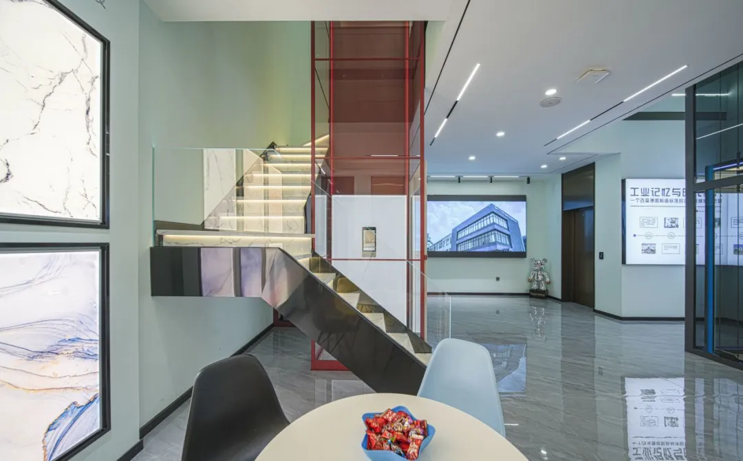 展位采用"双核交互"空间架构,设置人文服务中枢与电梯体验交互场域两大模块。服务区着力于提供茶吧、休憩、文化参观等空间;体验区则是让嘉宾试乘电梯,聆听大咖之言,与志同道合的小伙伴进行深入的交流。