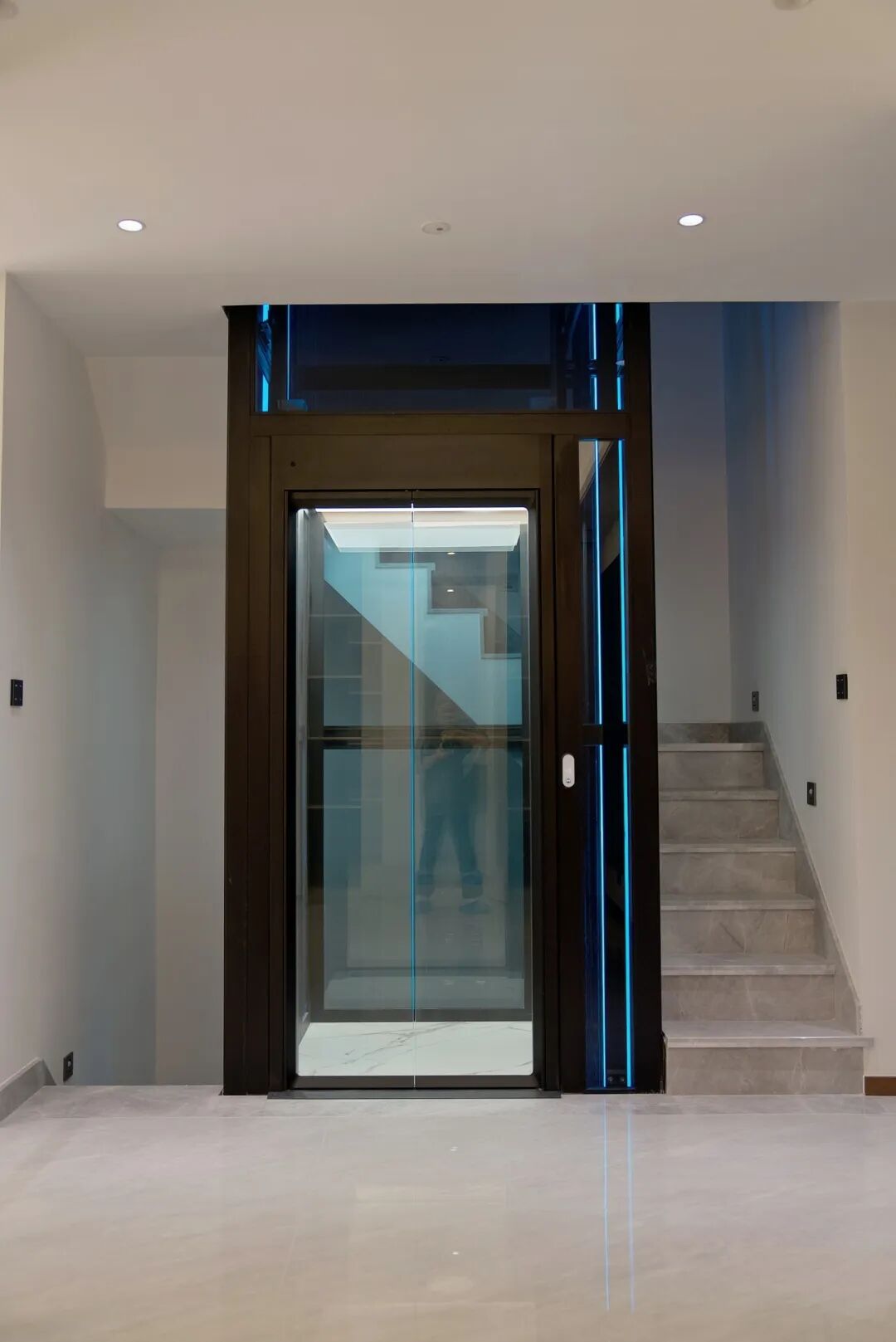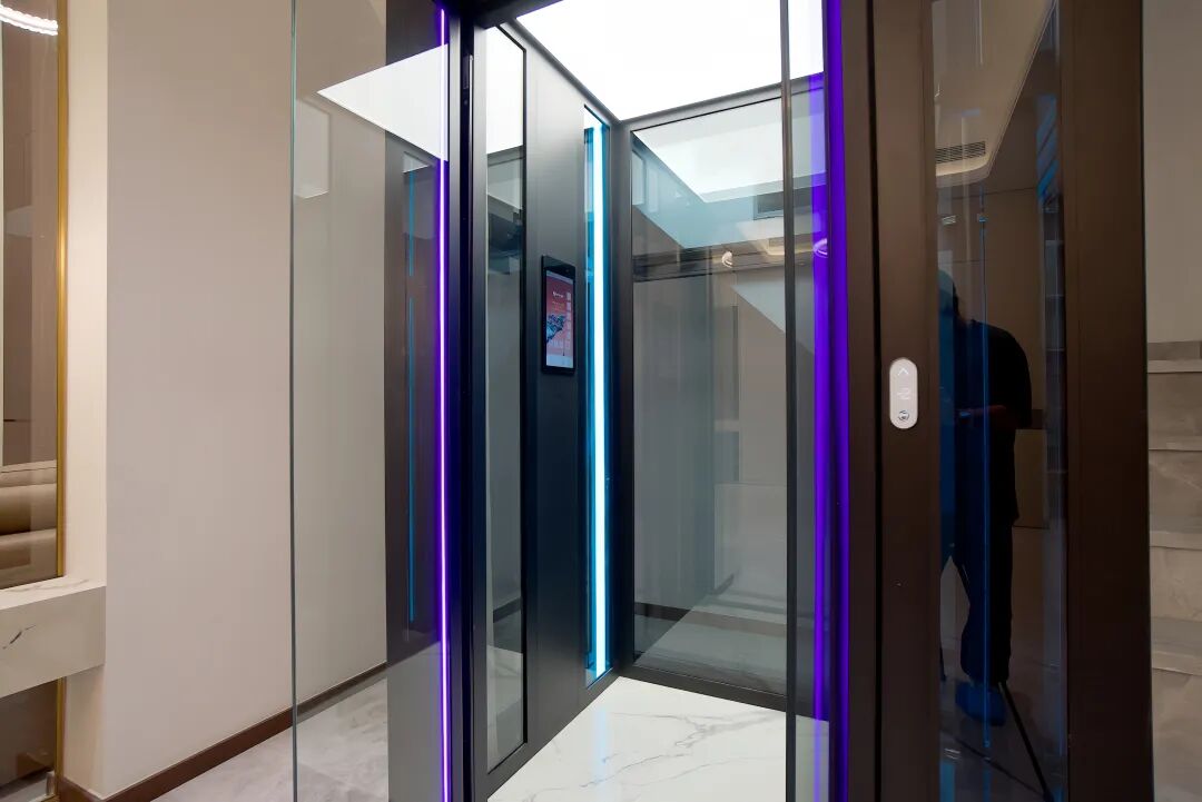弗朗茨在这台电梯中所采用的平开门设计,在开启时所占用的空间很小,提高了井道宽度的利用率;无边框的玻璃门,让轿厢内外的视觉更加连贯,在电梯的运行之中,犹如IMAX级高清视频,给予人们更多的想象。彩色的灯带与日光顶灯,与别墅内的吊灯光源交相辉映,璀璨夺目。