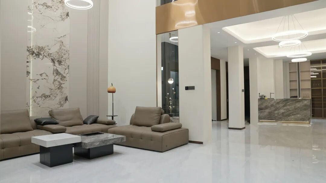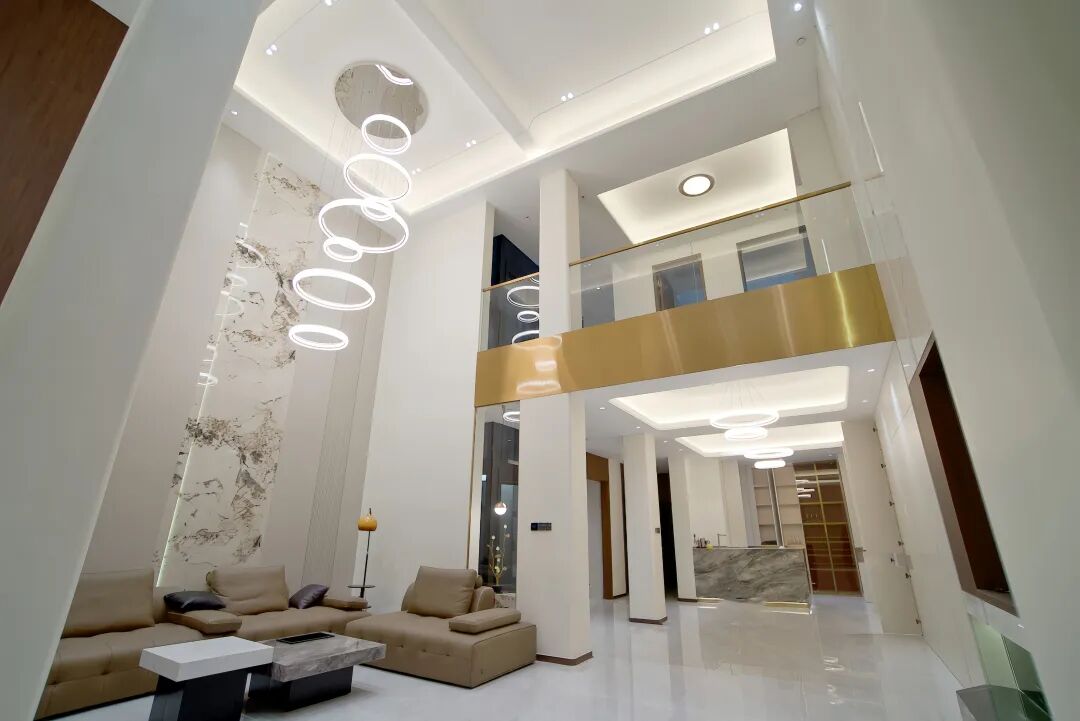 弗朗茨在青岛所承接的这一别墅项目,背靠太和山风景区,实为境藏山河的墅居别苑。在整体空间设计中,业主选择以现代轻奢风为这所复式大宅赋予灵魂。挑空的客厅搭配大尺寸的环形吊灯,极大地提升了空间的开阔感和纵深感。二楼以金色包边透明玻璃作为护栏,视线无遮挡,将上下空间融为一体。大尺寸的亮面瓷砖,再次放大了空间的通透感和现代感。