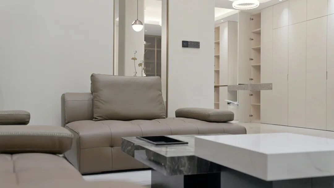 软装的设计,以温暖的氛围搭配大空间的高级感。浅棕色皮质沙发,线条简洁,大气舒适,与整体风格完美融合;简约的筒灯和线性灯带,配以艺术感十足的落地灯,构建了层次分明的灯光效果,烘托出浪漫的氛围。整个家呈现出高端的品质和浓厚生活气息。