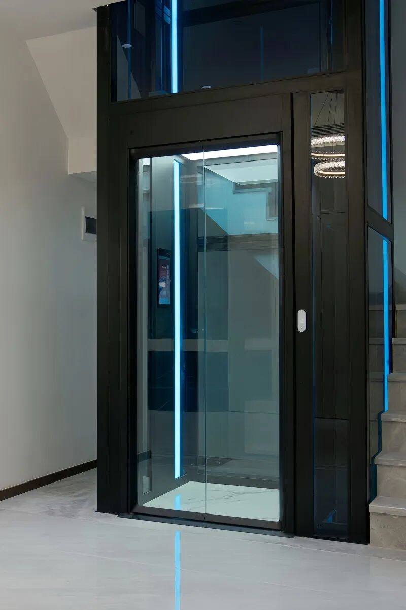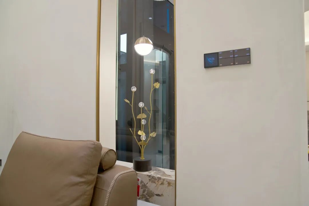 在这样轻奢温暖又自带反差感的空间内,弗朗茨突破了常规别墅电梯的理念桎梏,用“混搭”的风格呼应大宅的个性化。为了匹配宅邸轻奢、通透、大气的风格,弗朗茨选择了经典观光电梯作为垂直交通工具,大面积的钢化玻璃保持轿厢内视野开阔,景观无遮挡,既提升空间整体品质,又实现了低调、轻盈的视觉效果。