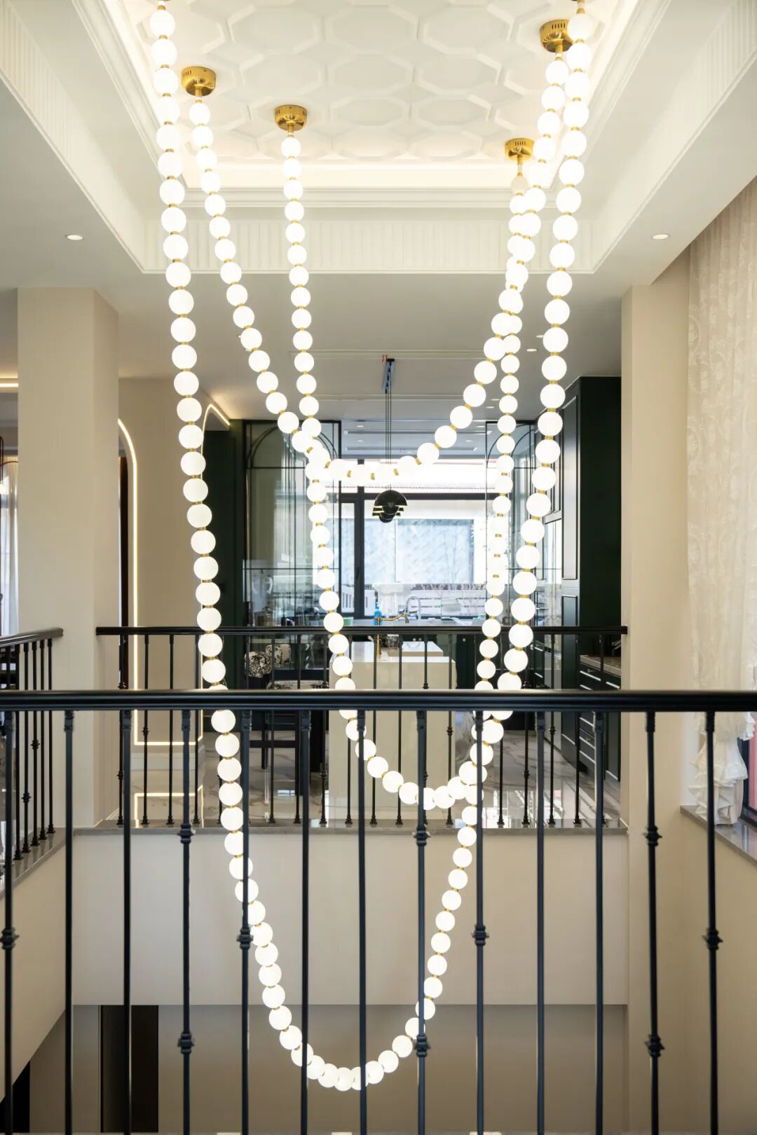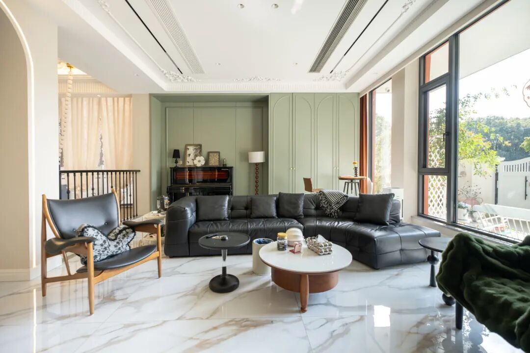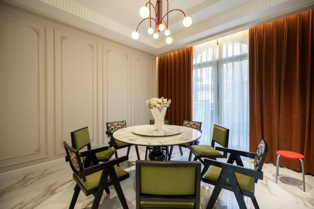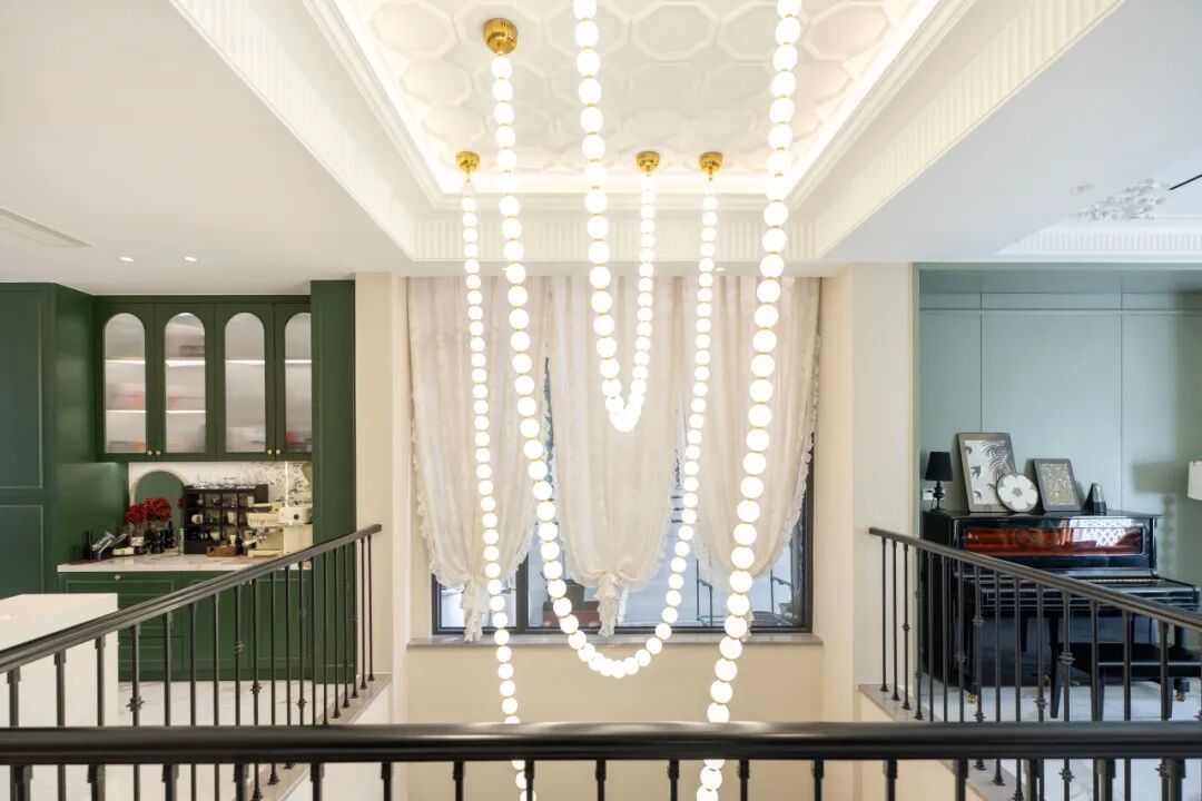 在对空间色彩的驾驭中,设计团队以巴黎郊区的春天为灵感,采用奶白色、莫兰迪绿色为基调,搭配黑金色和斑驳的大理石色,温柔之中透露出高级感。盛放的鲜花,是芳菲四月的时光好礼,红丝绒质地的窗帘,平添了欧洲宫廷式的浪漫与尊贵。珍珠项链造型的吊灯,打破了传统吊灯的规整形态,让光影在空间形成纵横交错的白月光,艺术感直接拉满。