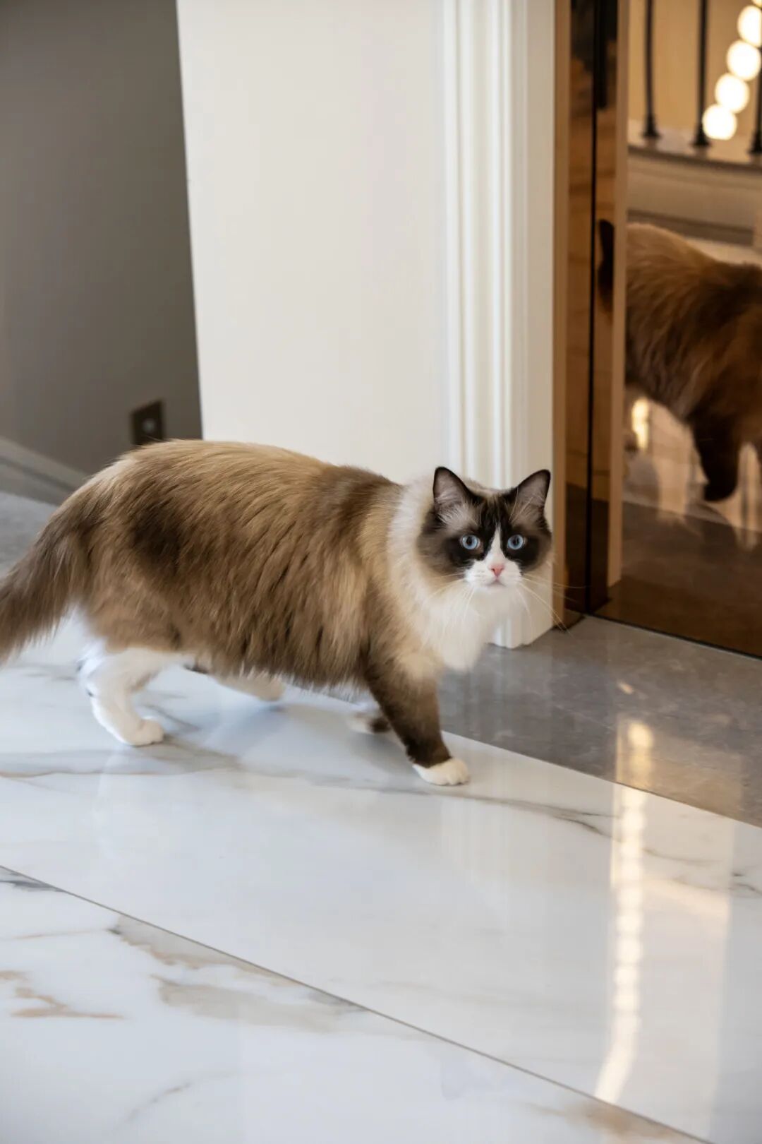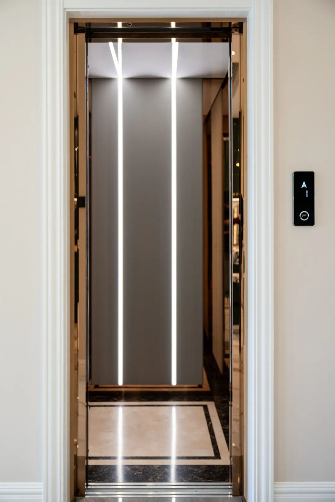 在配色方面,弗朗茨采用了玫瑰金的电梯门板与奶白色法式石膏线门套,暖色调的金属色泽,与圆润精致的线条,呼应整体空间的设计。镜面设计的门板,增强了空间视觉的通透性,还可当做全身镜整理仪容,让电梯乘坐更有仪式感和氛围感。