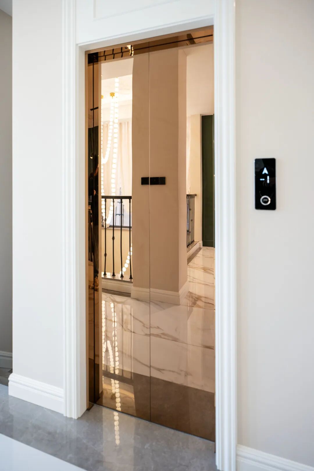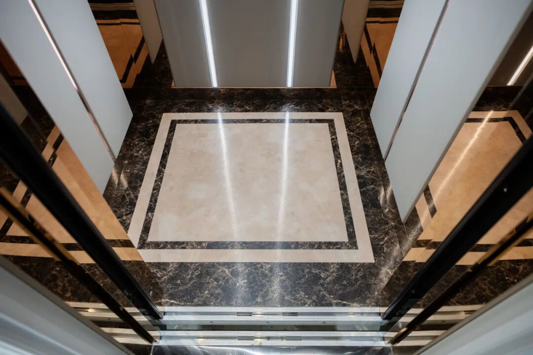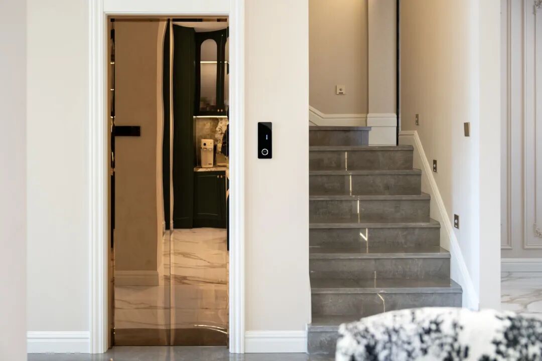 为了匹配空间的法式浪漫氛围,弗朗茨利用别墅预留的电梯井,在入户动线的核心区安装了土建轿厢电梯,从配色、灯光到工艺,全方位适配全屋风格,如同低调而又全能的管家,见证着业主对美好的奔赴。