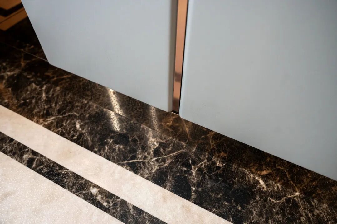 对于工艺的考量,弗朗茨将深色的大理石回形拼花设计与全屋的大理石风格进行了统一。在整体的安装过程中,对缝隙的处理和收口的工艺力求做到了严丝合缝,工艺精度拉满,并采用易清洁设计,维护成本极低,适配家庭使用场景。