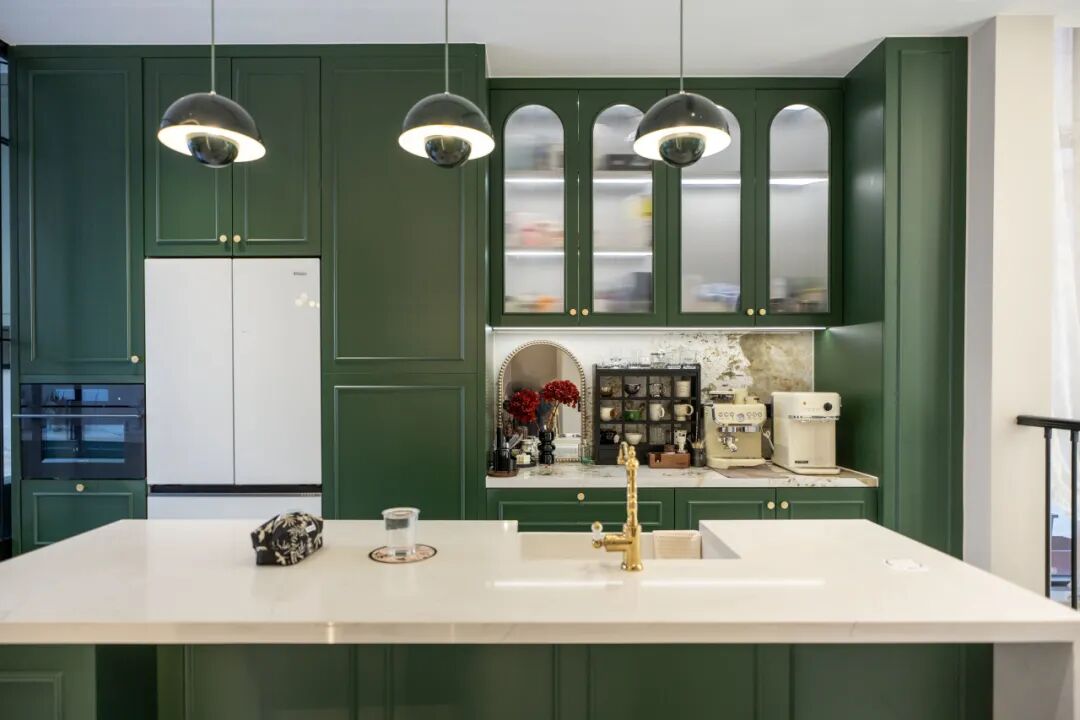 在空间细节的打磨中,业主选择以流畅的石膏线、繁复的雕花勒出层次感,搭配嵌入式中央空调,在保留法式优雅的同时,兼顾了现代居住的舒适。复古的拱形玻璃柜门、年代感十足的杯子藏品与现代化的咖啡机、烤箱、饮水器同框。法式经典元素与现代简约设计碰撞,呈现出“去繁就简”的美学重构。